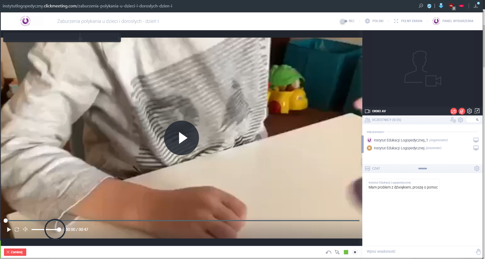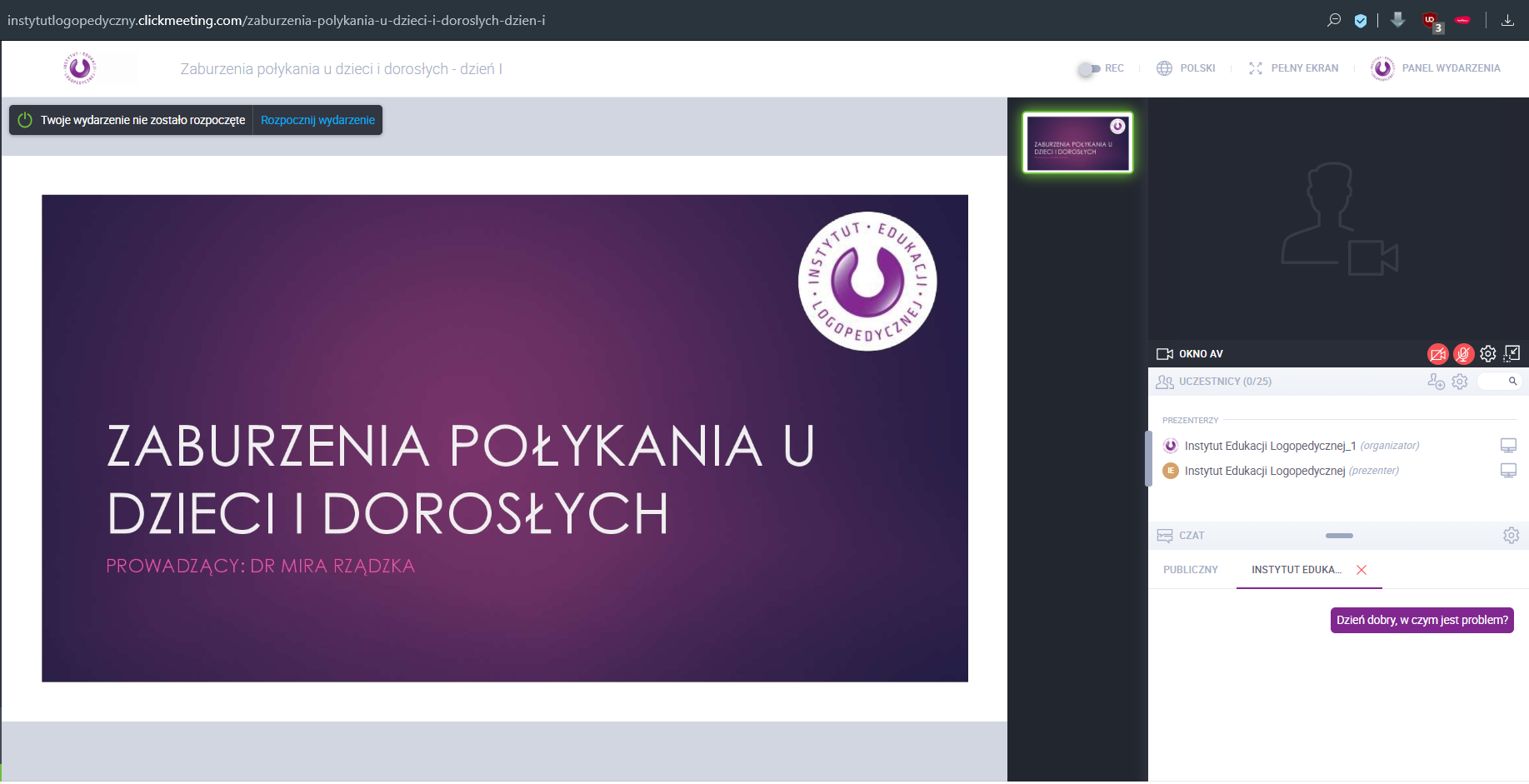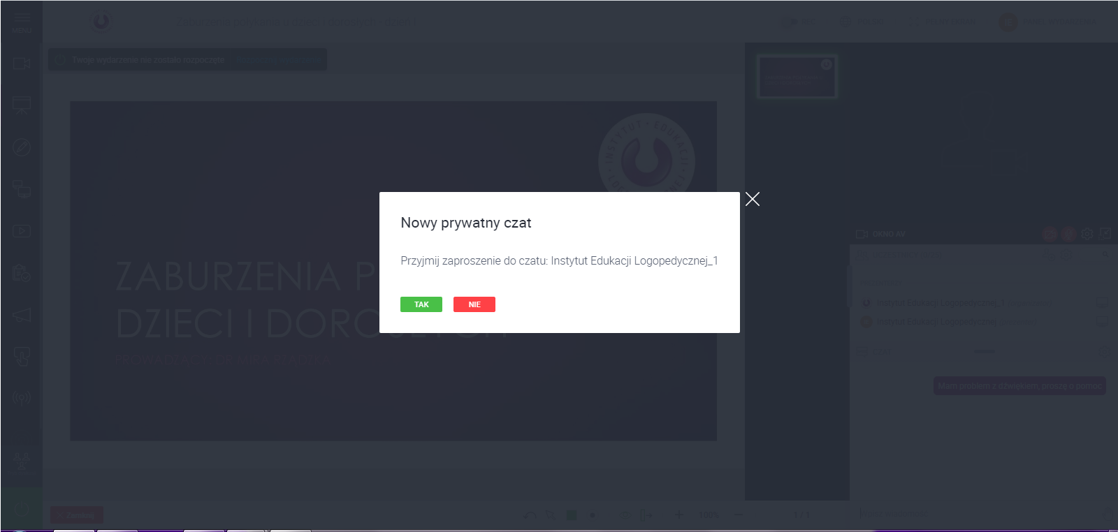 Zaznaczony obszar na dole to czat służący do komunikacji między uczestnikami, prowadzącym i organizatorem. W przypadku problemów technicznych organizator może uruchomić tzw. czat prywatny z daną osobą - wówczas widok dla tej osoby przedstawia się następująco: