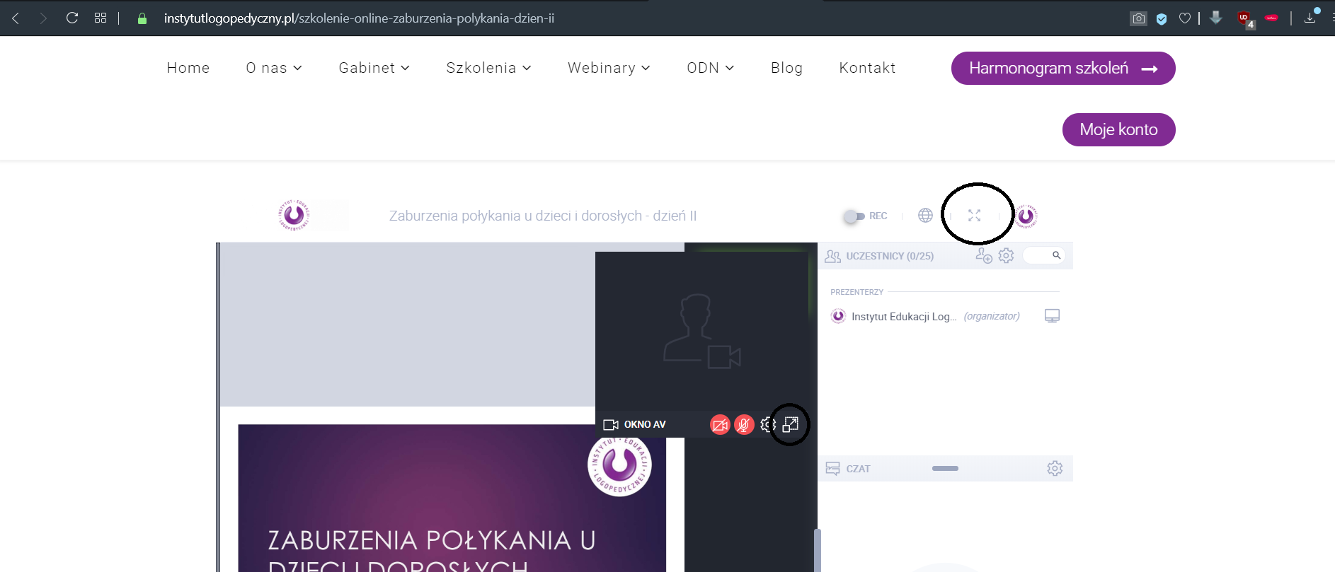 Na załączonym zdjęciu zaznaczone są dwa przyciski. Pierwszy przycisk (w górnym prawym rogu) służy do rozszerzenia widoku pokoju na pełen ekran, zaś drugi przycisk do "przypięcia" widoku video prezentera tak, aby to okno nie zasłaniało wyświetlanej prezentacji.