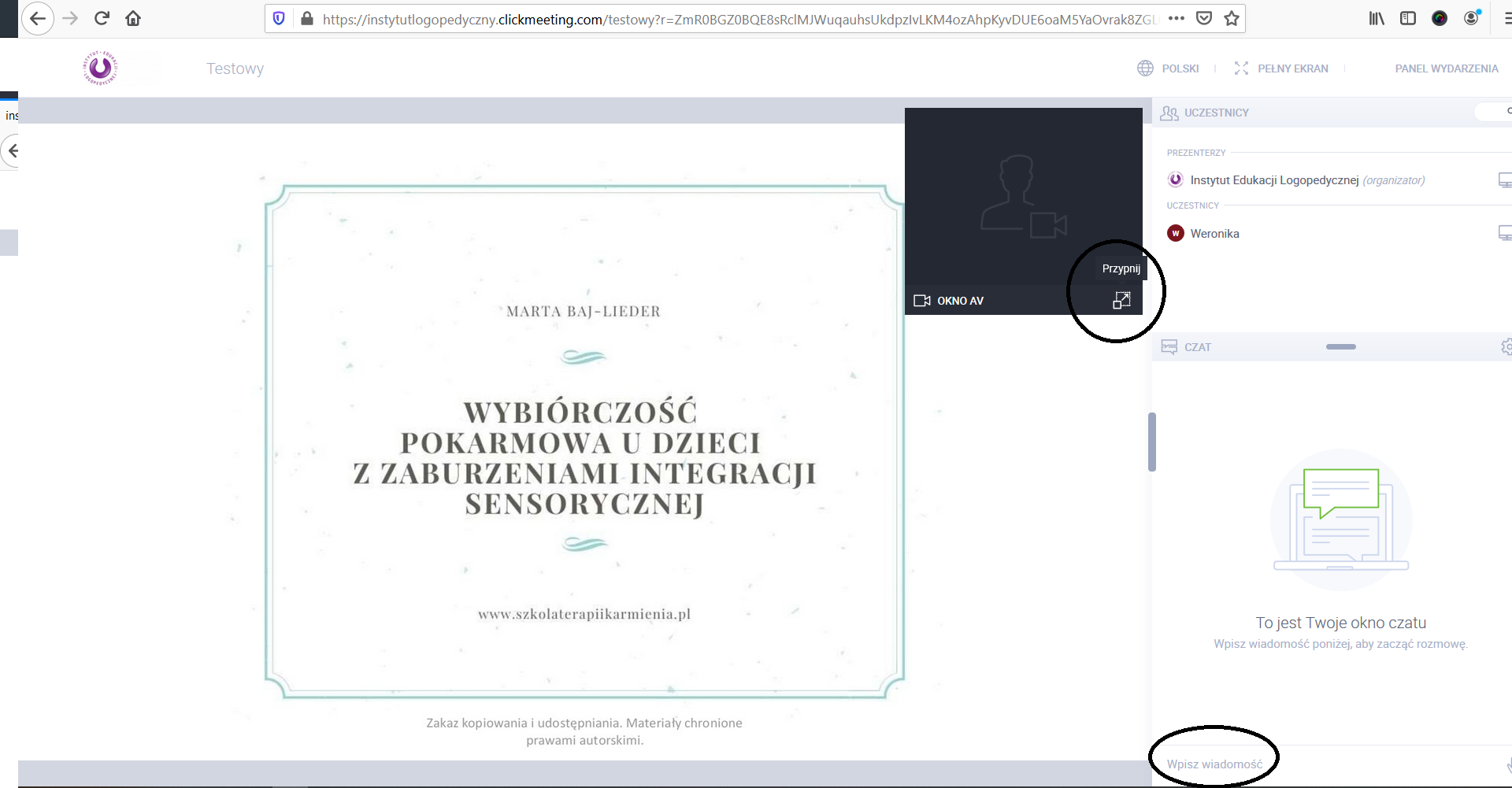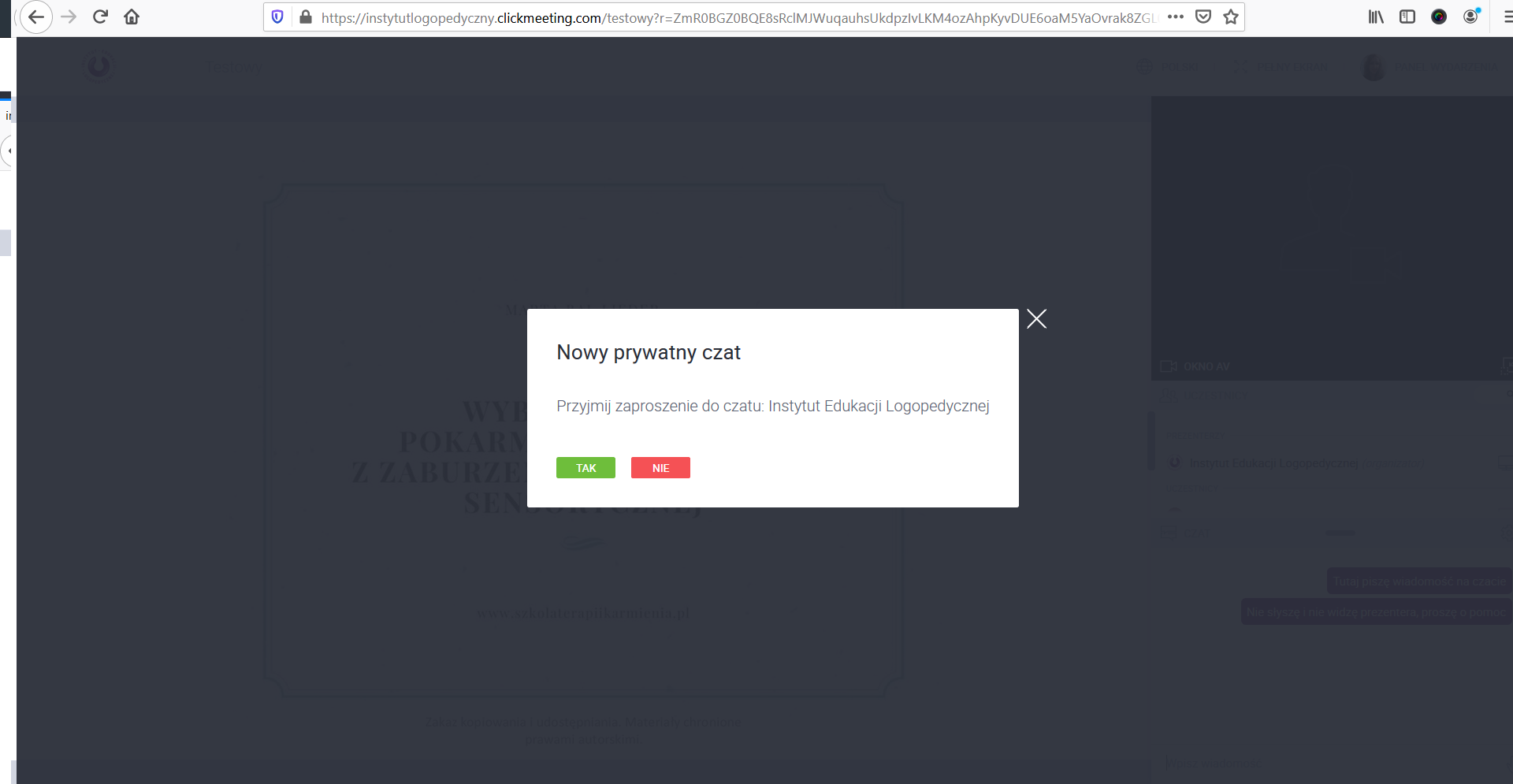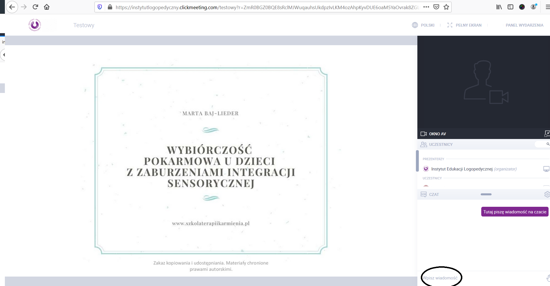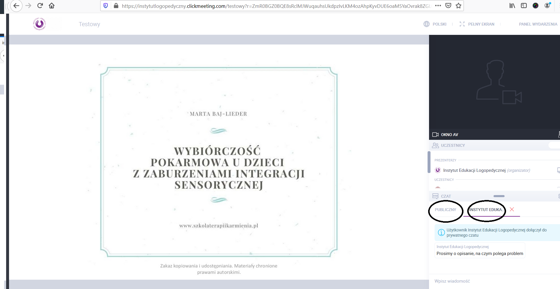 Inni uczestnicy nie widzą tego czatu prywatnego, zaś korzystanie z niego pozwala na płynne kontynuowanie tematu przez osobę prowadzącą. W przypadku, gdy organizator nie odpowiada przez dłuższą chwilę na czacie prywatnym prosimy o cierpliwość - na pewno się odezwie ponownie.