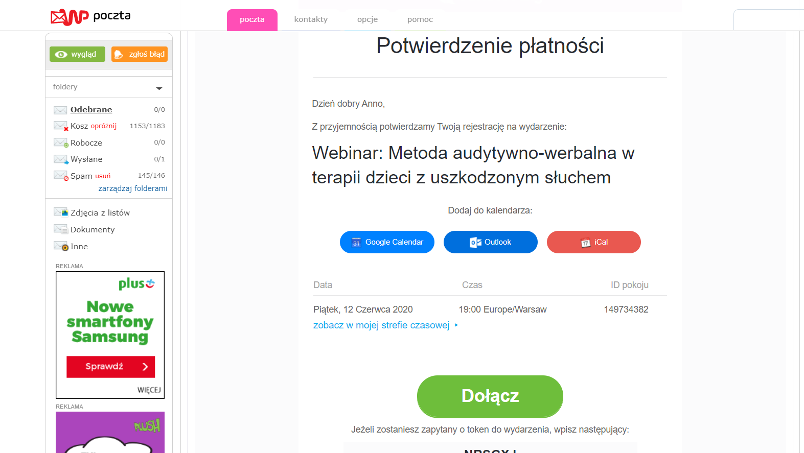 W przypadku nie otrzymania e-maila z dostępem do 1 godziny przed wydarzeniem prosimy o zgłoszenie tego faktu na adres: